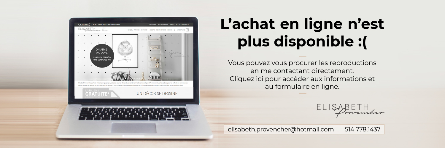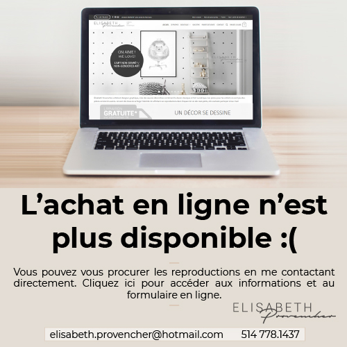 Élisabeth Provencher, artiste et designer graphique, crée des œuvres décoratives combinant le dessin classique et l’art numérique. Les pièces pour les enfants ne sont pas des pièces comme les autres. Ce sont des lieux où se forge l’identité. En affichant ses reproductions dans l’espace de vie des tout-petits, elle souhaite participer à leur éveil artistique et créatif.